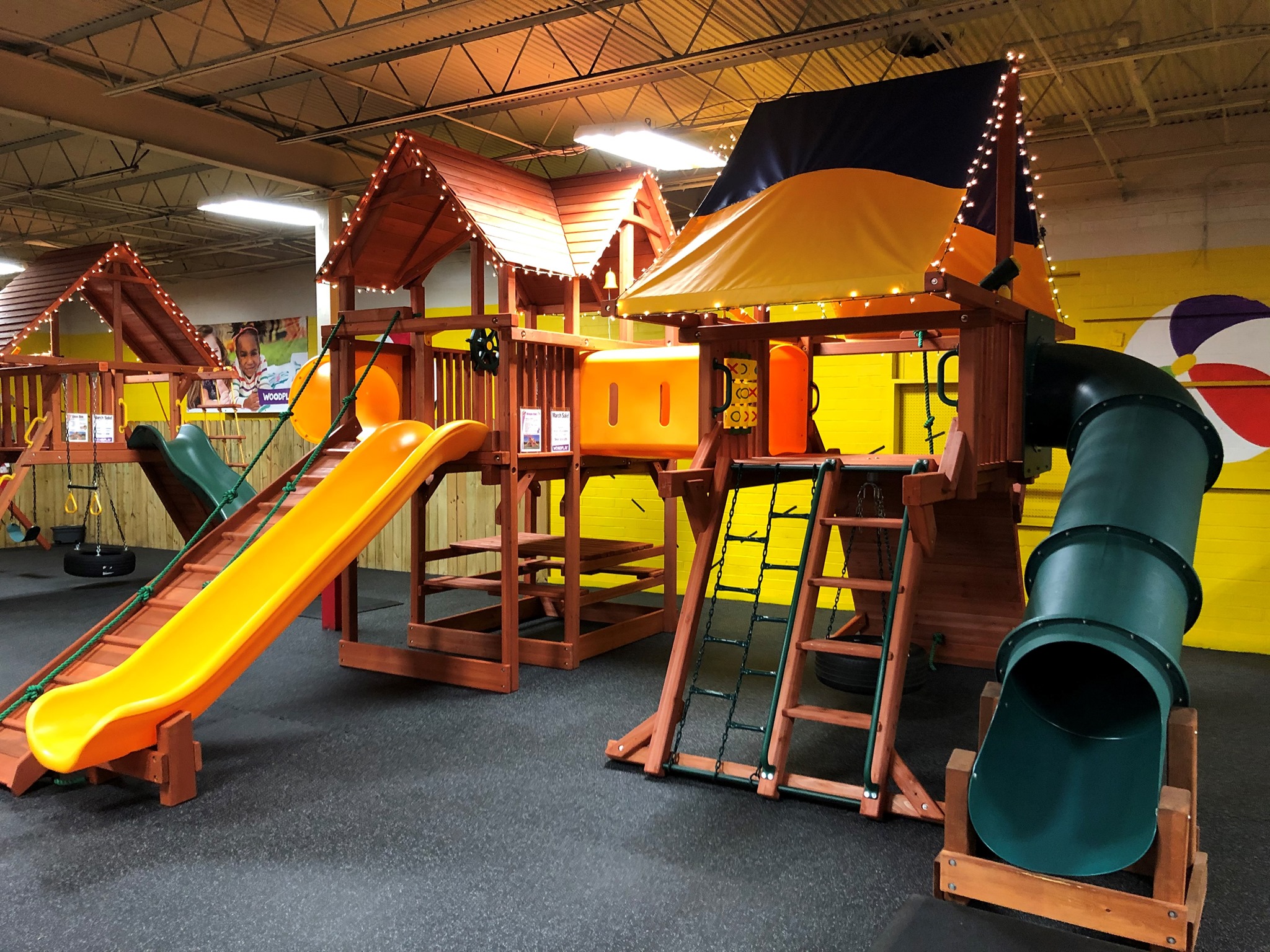 Experience the fun of Woodplay before it ever reaches your backyard. Our Raleigh showroom is a huge, hands-on space where you can see our playsets, goals, trampolines and more up close, compare options side-by-side, and get a real feel for the craftsmanship, safety features and endless ways to customize for your family.